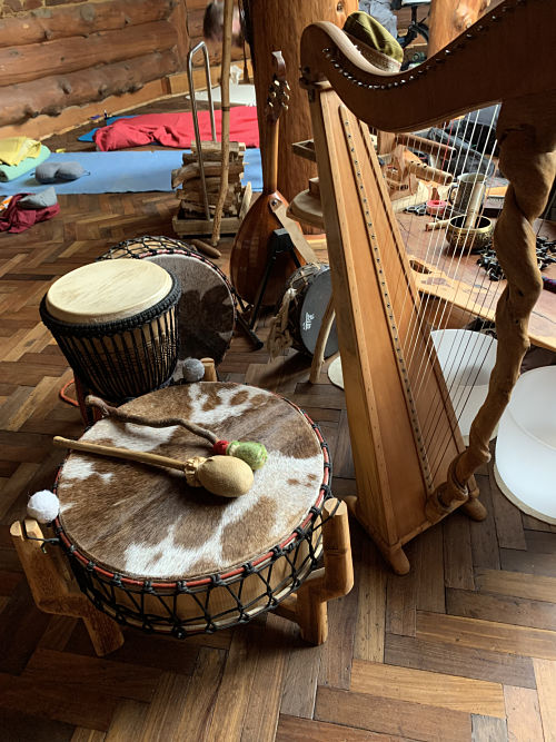 Während der beiden Zeremonien spielten Mark und der Musiker auf den unterschiedlichsten Instrumenten. Handpan, Gitarre, Drums, Kalimba, Harfe und noch anderen. Manchmal konnte ich die Lieder richtig genießen, voll im Moment sein, andere male haben sie mich wahnsinnig gemacht. Einmal dachte ich sogar: “Oh Mein Gott!! Mark kann die hässlichste Musik auf der ganzen Welt machen!” und hatte dazu das Bild eines Tatorts vor Augen, wo die Leiche mit Kreide nachgezeichnet wird.