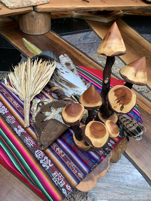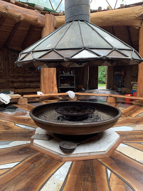 Er erinnert an eine Hobbithöhle, hat einen großen Sitzkreis rund um ein Lagerfeuer in der Mitte. Außen ist genug Platz für Matratzen, auf denen wir während der Zeremonien gelegen haben.